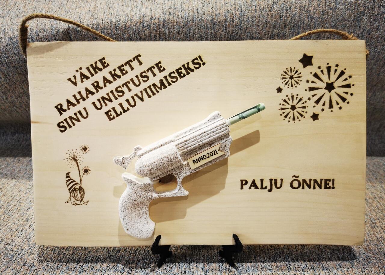 Puidust silt sünnipäevaks. Sildi peal olevatesse esemetesse on võimalik raha lisada. Silt valmistatud täis puidust, raketi püstol valmistatud 3D printeriga.